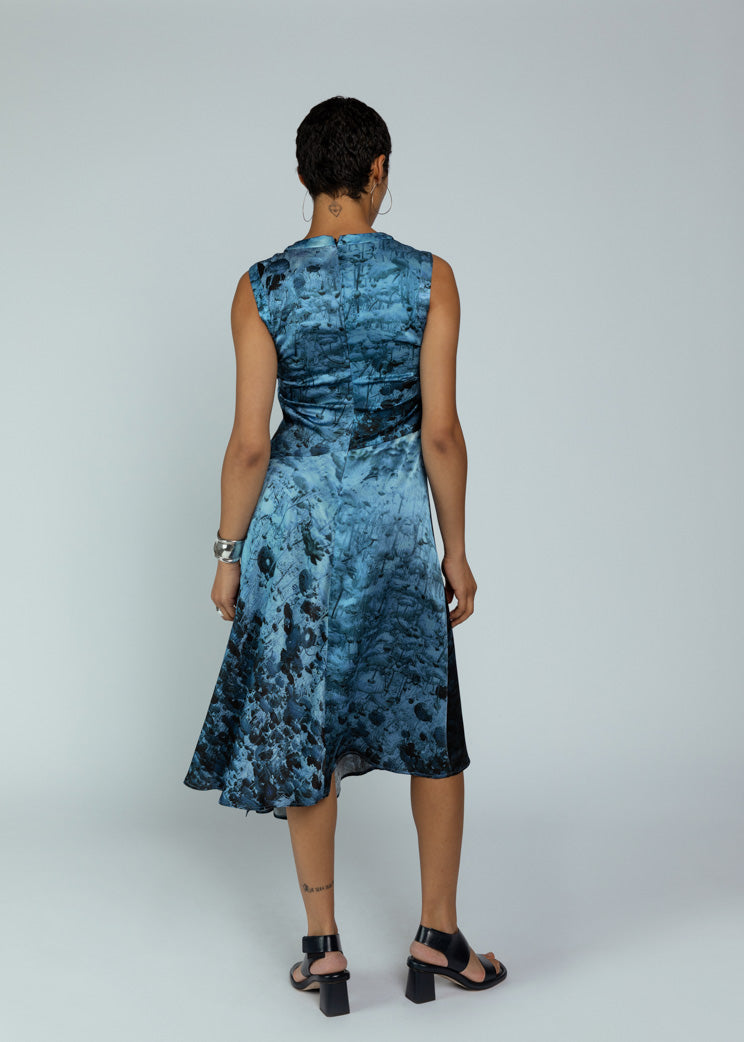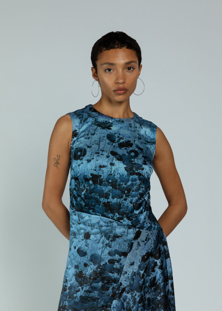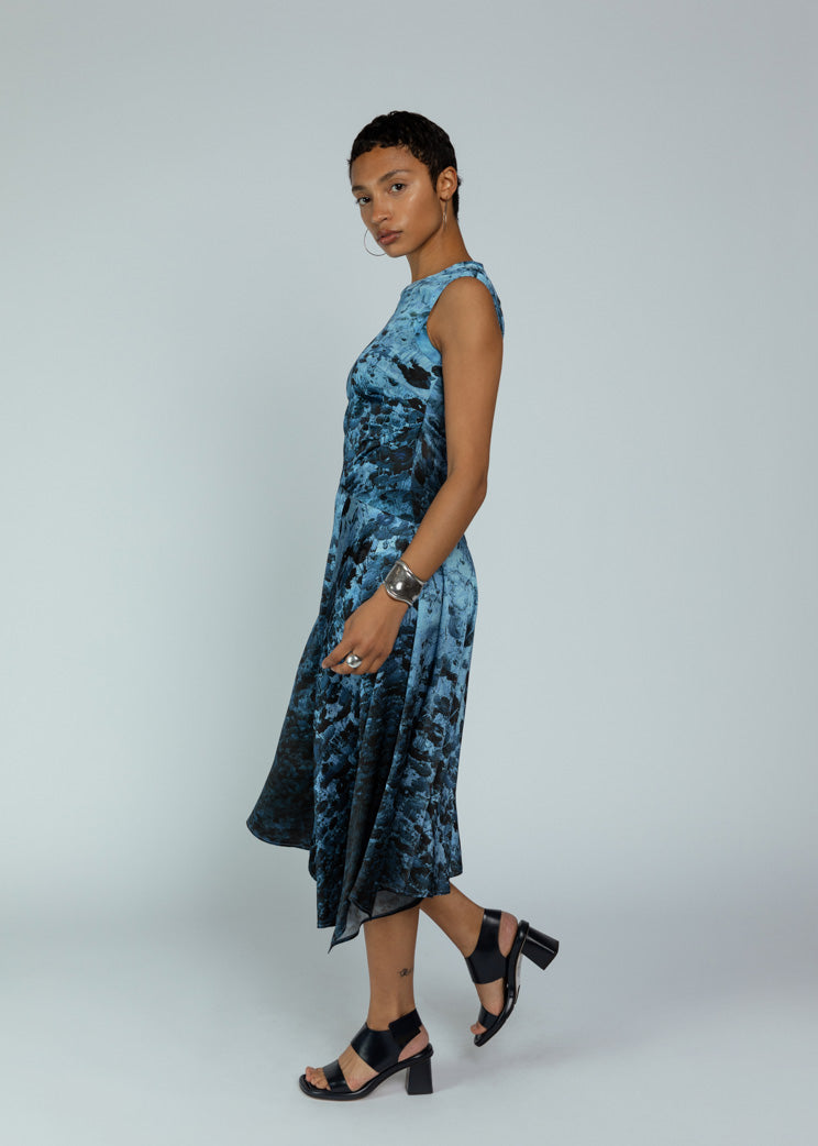 No. 6's Silk Nina Dress is a crewneck sleeveless dress crafted of hammered silk and features a paneled, asymmetric a-line skirt and rear zip closure.