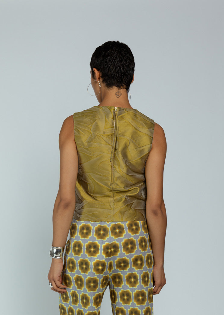 Color citrine. 54% polyester, 30% viscose, 4% polyacrylic, 2% metallic fibers.