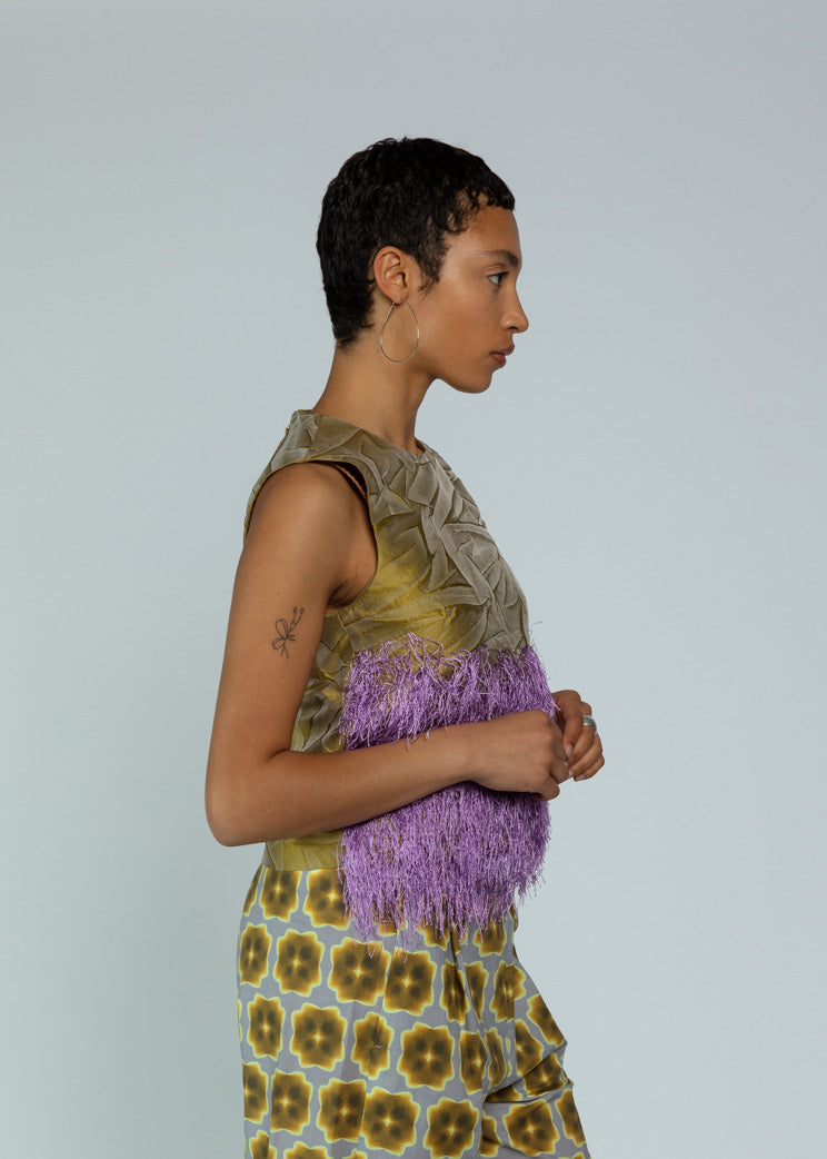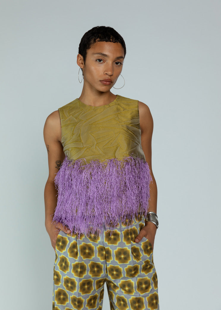 Odeeh's Cheerleader Top is crafted of a shimmery crinkled fabric and contrast fringe front and features a center back zipper.