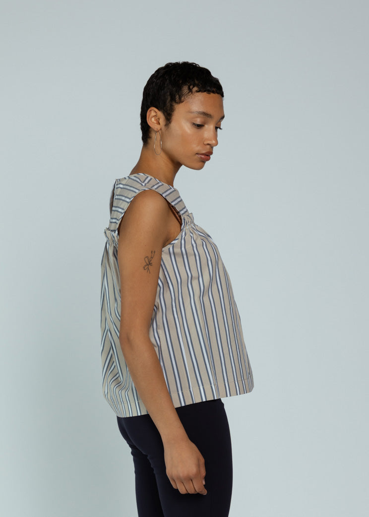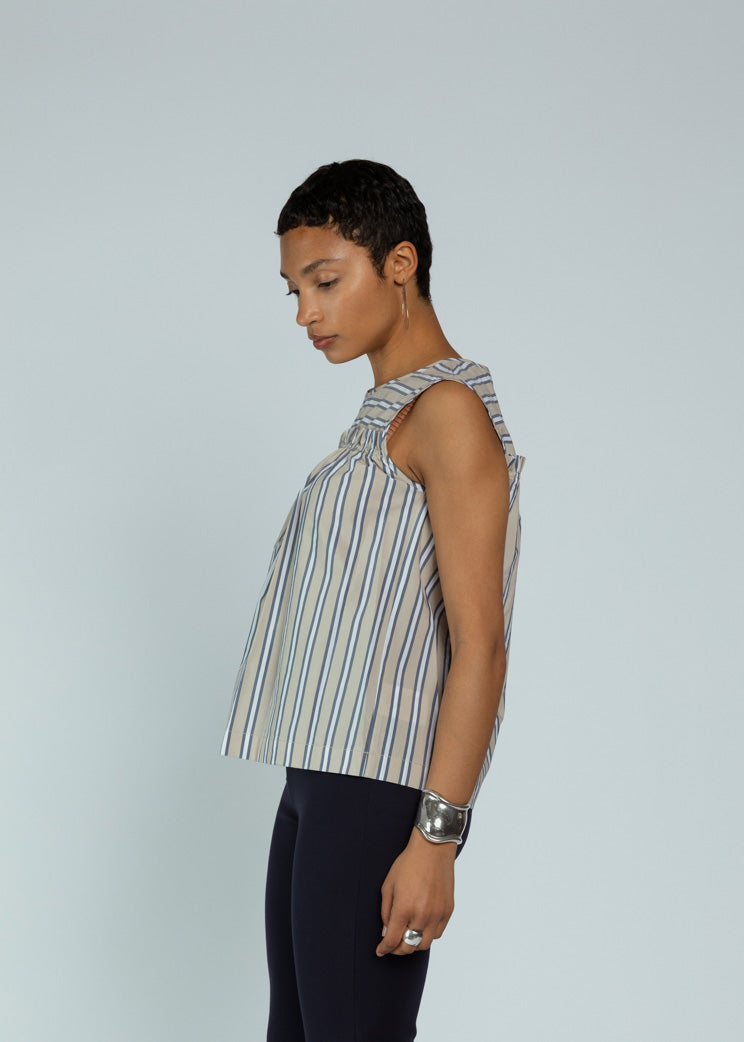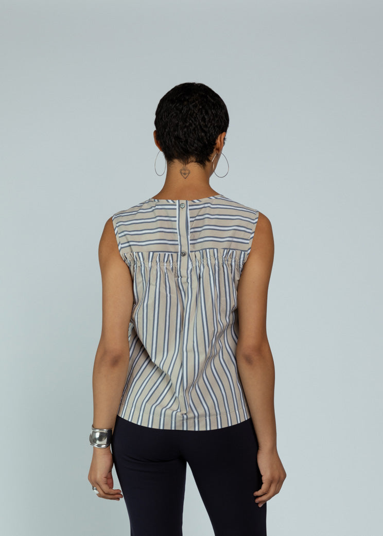 Odeeh's Summer Top is a sleeveless top crafted of a cotton blend and features horizontal yoke with front pleating and rear button closure.