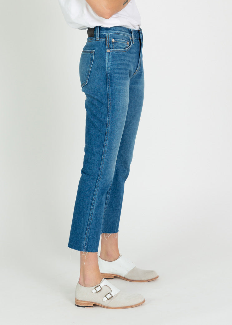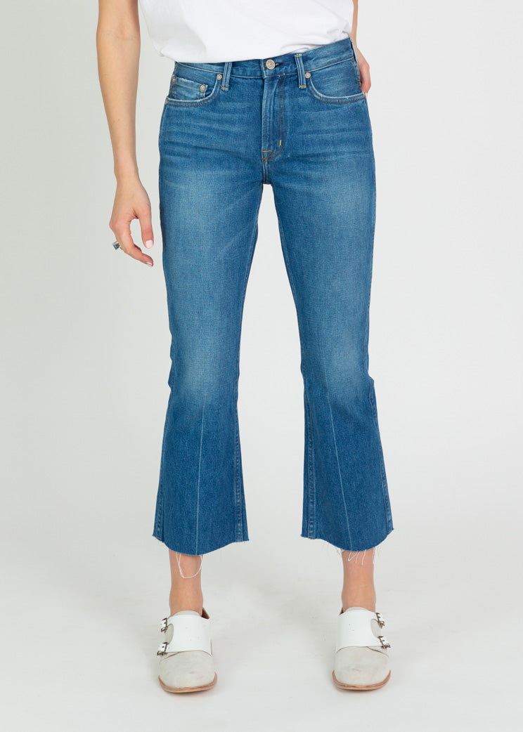 NOEND Denim's Farrah Kick Flare Jean features a cropped and flared style with an unfinished hem.
