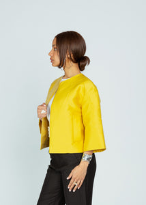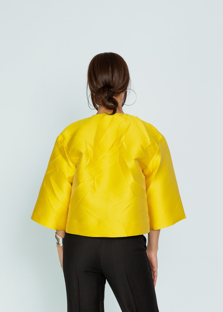 Color lemon. 84% polyester, 16% silk. Lining 70% acetate, 30% polyester.